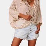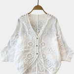 Delicada y sin esfuerzo chic, esta blusa de crochet con calados combina el encanto vintage con la elegancia bohemia moderna. Confeccionada en algodón transpirable, presenta bordados florales, un escote en V profundo y detalles intrincados de encaje para un look romántico y libre. Ideal para cualquier ocasión, la Aitana se convertirá en un básico atemporal en tu armario de tops.