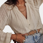 Descubre la Blusa Hanalei, un esencial bohemio de playa que cada mujer debe tener. Esta elegante blusa de encaje vintage es perfecta para largos días de verano. Con detalles intrincados de calado, añade un toque de estilo y feminidad a cualquier atuendo casual. Confeccionada en una mezcla de algodón y poliéster, esta blusa se siente tan bien como se ve.