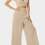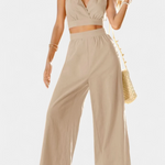 Descubre la elegancia y comodidad en cada ocasión con nuestro conjunto Isabel. Ideal para la primavera y el verano, este conjunto destaca por su diseño sofisticado que incluye un top corto de encaje con espalda abierta y pantalones anchos de tiro alto. La silueta fluida y el escote en V, combinado con detalles femeninos, crean un aire romántico que te hará sentir única y especial.