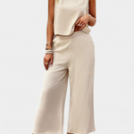 Espíritu libre con un aire natural y relajado. El conjunto Lavinia combina un top de tirantes con shorts de cintura elástica, confeccionado en una mezcla de lino y algodón que aporta frescura y textura bohemia. Diseñado para los días de descanso bajo el sol, este look desenfadado y chic es tu aliado perfecto para este verano.