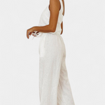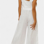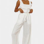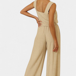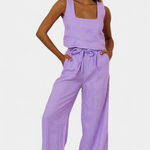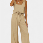 Ligereza natural y frescura sofisticada. El conjunto Mireia combina un estilo relajado con acabados cuidados para acompañarte con elegancia en los días más cálidos. Este conjunto de verano incluye una blusa sin mangas con escote cuadrado que resalta los hombros y un pantalón fluido de pierna ancha con lazada ajustable en la cintura. Perfecto para la mujer moderna que busca comodidad y estilo en sus outfits.