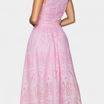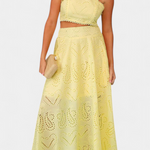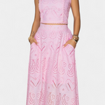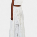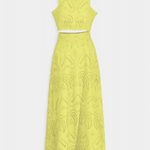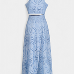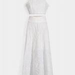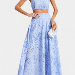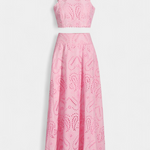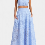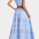 Romántico y ligero, el conjunto Teresa es perfecto para cualquier ocasión, fusionando la frescura veraniega con la delicadeza del encaje floral calado. Este conjunto de dos piezas incluye un top corto sin mangas, con cuello alto y acabado festoneado, que aporta un aire elegante y sofisticado. La falda maxi de cintura alta y vuelo amplio complementa el look, haciéndolo ideal para eventos en la playa o al aire libre.