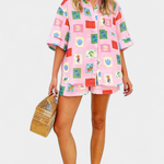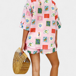 Fresco, alegre y perfecto para los días soleados, el conjunto Valentina es tu aliado ideal para momentos de Beach&Outdoors. Este diseño combina una camisa de manga corta con cuello solapa y botones frontales, junto a unos shorts de cintura alta con cinturilla elástica y cordón ajustable. Con su estampado vibrante y silueta relajada, este look veraniego te acompaña en cada aventura bohemia.