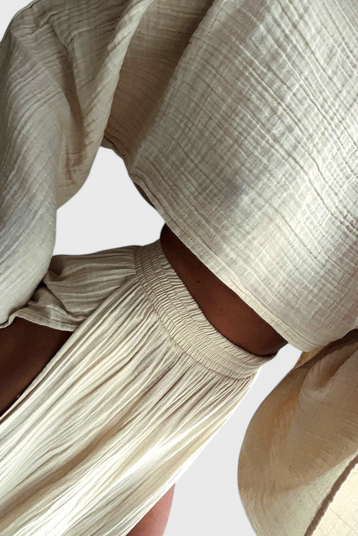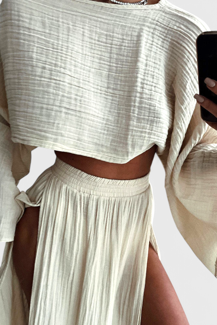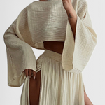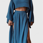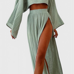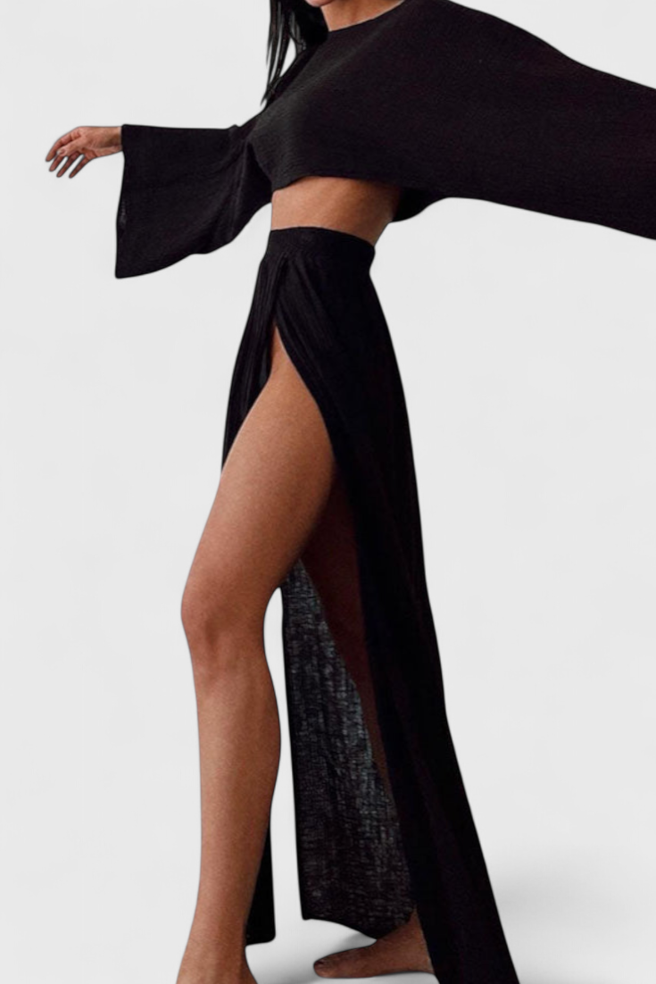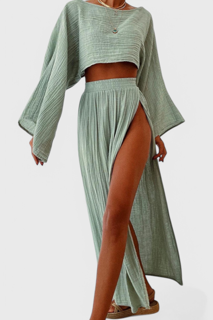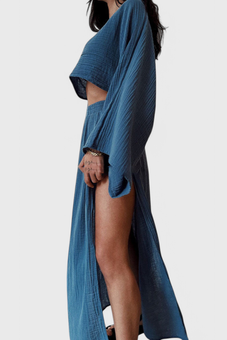 Ligero, sofisticado y hecho para impresionar, el conjunto Valentina fusiona estilo moderno con una fluidez envolvente. Su top corto aireado y la falda con abertura lateral crean un equilibrio perfecto entre elegancia y frescura, ideal para días soleados o noches especiales.