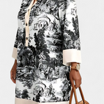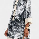 El vestido Estela fusiona arte y moda con un estilo relajado y sofisticado. Su estampado tipo toile de Jouy en escala de grises aporta un aire clásico, mientras que su silueta suelta y los detalles en contraste elevan su carácter contemporáneo. Ideal para paseos costeros o escapadas de verano, este vestido camisero es perfecto para cualquier ocasión. Atrévete a brillar con los vestidos de verano más elegantes y frescos.