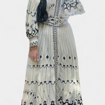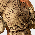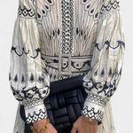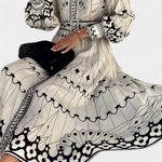 Fusionando el encanto vintage con la elegancia inspirada en el folclore, el Vestido Soria presenta un hermoso estampado en negro sobre crema y bordados artesanales. Con su cuello mandarín y un frente de botones completo, este dressing bohemio destaca por sus llamativas mangas globo, creando una silueta elegante y ajustada que te hará sentir única en cualquier ocasión.