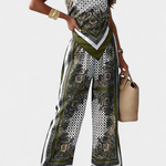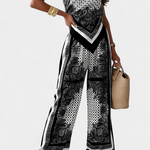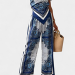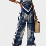 Haz girar cabezas con el Conjunto de Bufanda Paisley: una mezcla ligera de estampado audaz y elegancia relajada. Con su top bandeau con tiras y pantalones de pierna ancha fluidos, este conjunto captura la esencia de la sofisticación despreocupada para días cálidos y noches inolvidables. Su tejido suave garantiza comodidad y estilo en cada ocasión.